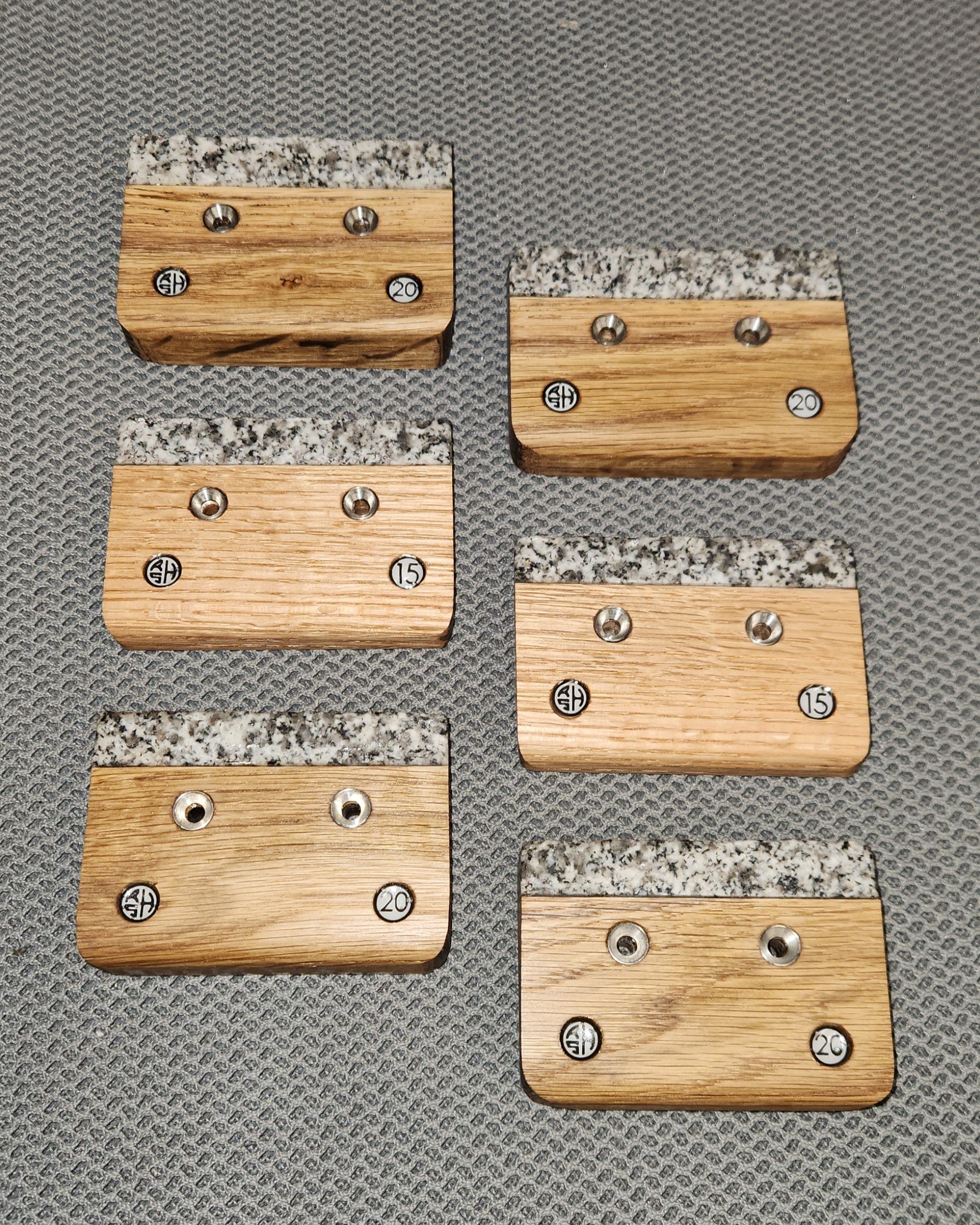Matching pair of edges made with a combination of granite and oak. They are the perfect addition to your hangboard setup/area. The granite edge provides the perfect real rock texture to prepare your skin for the outdoors.