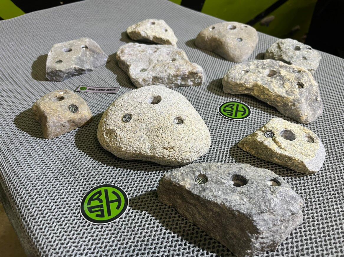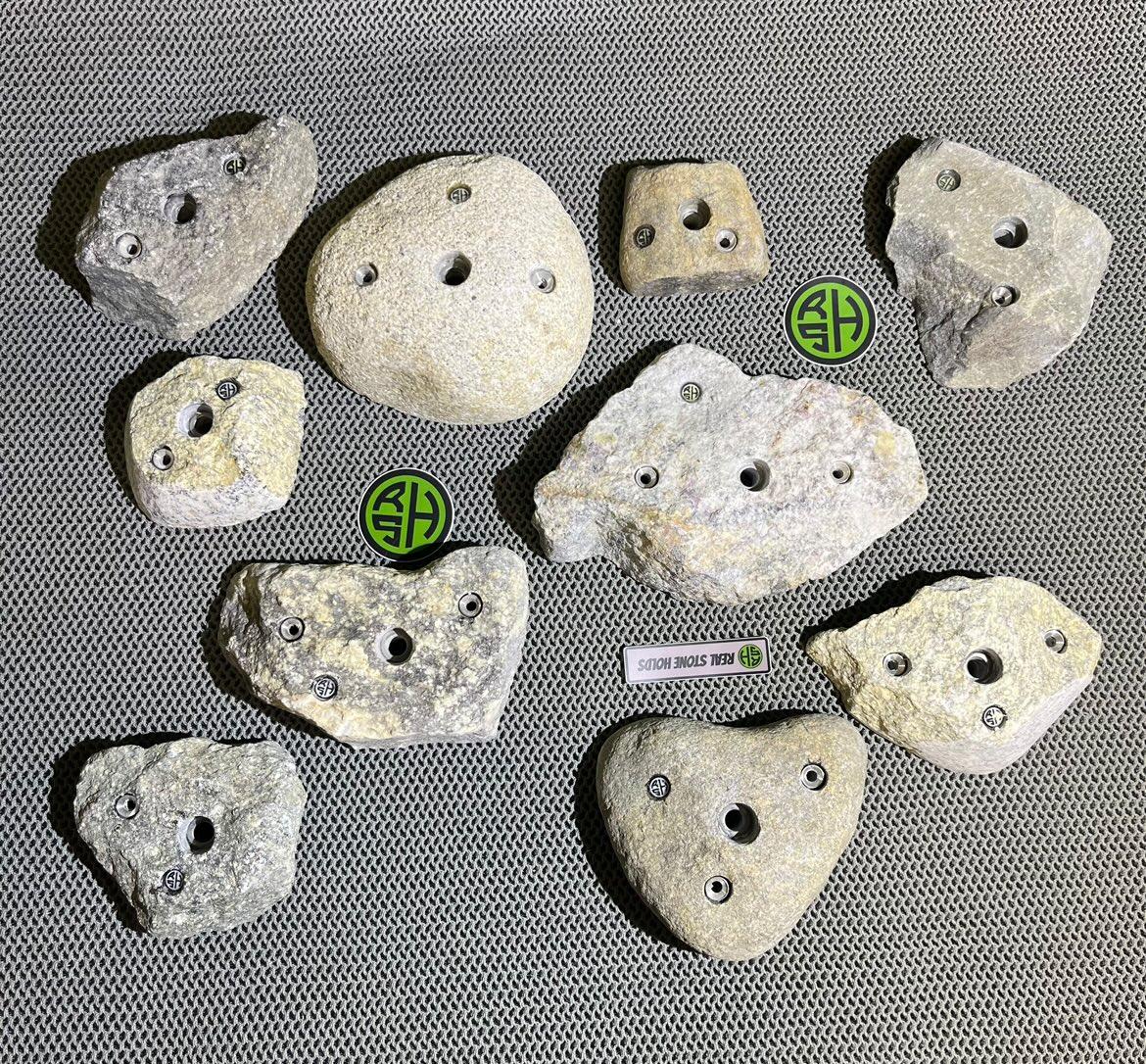 This bundle package includes quantity 10 premium bolt on holds. Holds are made from real stone sourced in New England. They are equipped with 1 bolt and at least 1 setscrew. Stainless steel and RSH logo inserts included.